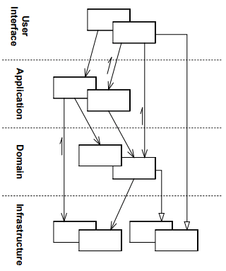 Un système en couche donne accès aux couches du dessous à celles qui sont au-dessus. Équivalent à la couche présentation, l’User interface correspond à l’affichage des informations et à la récupération des actions de l’utilisateur. La couche Application regroupe les services (coordonne les tâches des couches inférieures). L’Infrastructure fournie des techniques génériques pour supporter les couches supérieures, comme envoyer un mail, dessiner un objet d’interface graphique, persister le domaine.