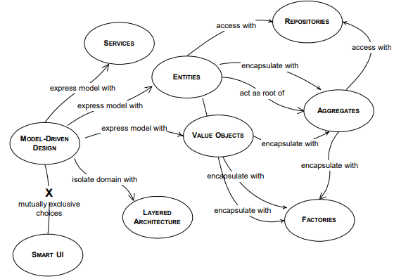 Pour mettre en pratique le DDD dans un système logiciel, on utilisera une conception basée sur un modèle ou model-driven design en anglais. Il est important que le code de l’application soit le reflet d’un modèle, contrairement à une analyse qui ne va pas modeler la future application. Le meilleur modèle d’Eric Evans, créateur du DDD, est celui-ci :